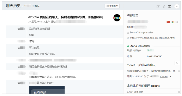 比如您可以在网站上嵌入Zoho SalesIQ访客实时聊天工具的代码,不仅能在网页上跟您的客户开展实时聊天,还能追踪到什么人曾经访问过您的网站,他们看了什么内容,看了多长时间,网站的访问路径等等。客户互动历史和详细资料也可以存入Zoho CRM进行保存。假若客户反馈了一个产品问题或者需要服务,还可以直接生成Zoho Desk工单,纳入客户服务体系中进行管理。