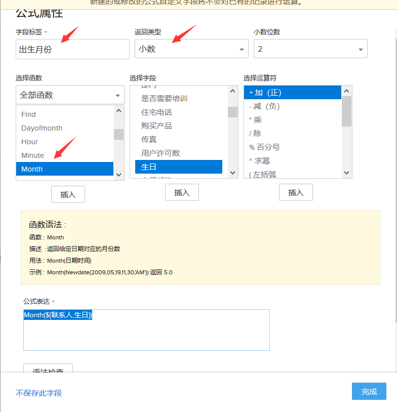 1)访问设置->模块->联系人。拖放一个公式字段并粘贴下面的表达式到公式属性的公式表达中,将字段命名为“出生月份”并保存公式。