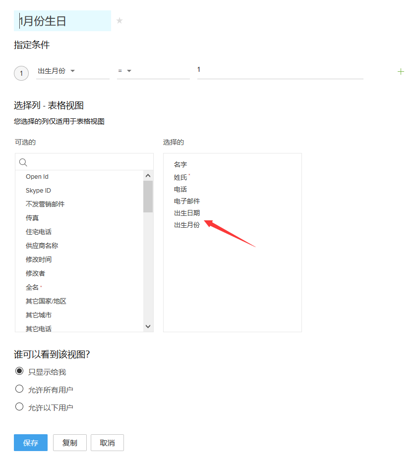 3)指定条件为 如果 “出生月份” 等于 “1”,则将视图命名为“1月份生日”,并将出生月份和出生日期列添加到视图中。