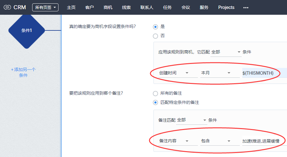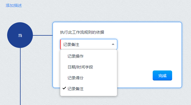 在“执行此工作流规则”中选择“记录备注”,这条工作流就会针对备注内容生效。