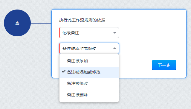 接下来,选择当备注发生什么变化时,启动这个工作流规则。根据模拟场景,选择“备注被添加或修改”时执行。您也可以根据实际业务选择添加、仅修改或删除时执行。