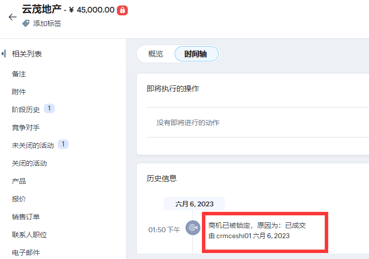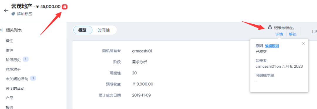 配置完成以后,被锁定的记录详情页上会出现红色小锁的标志,并且可以查看锁定记录详情,比如:锁定原因、锁定人、锁定时间。