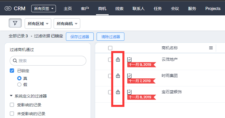 如果被锁定的记录比较多,并且希望把所有被锁定的记录一起显示出来,可以用系统预置的过滤器——已锁定,把锁定的记录都筛选出来。