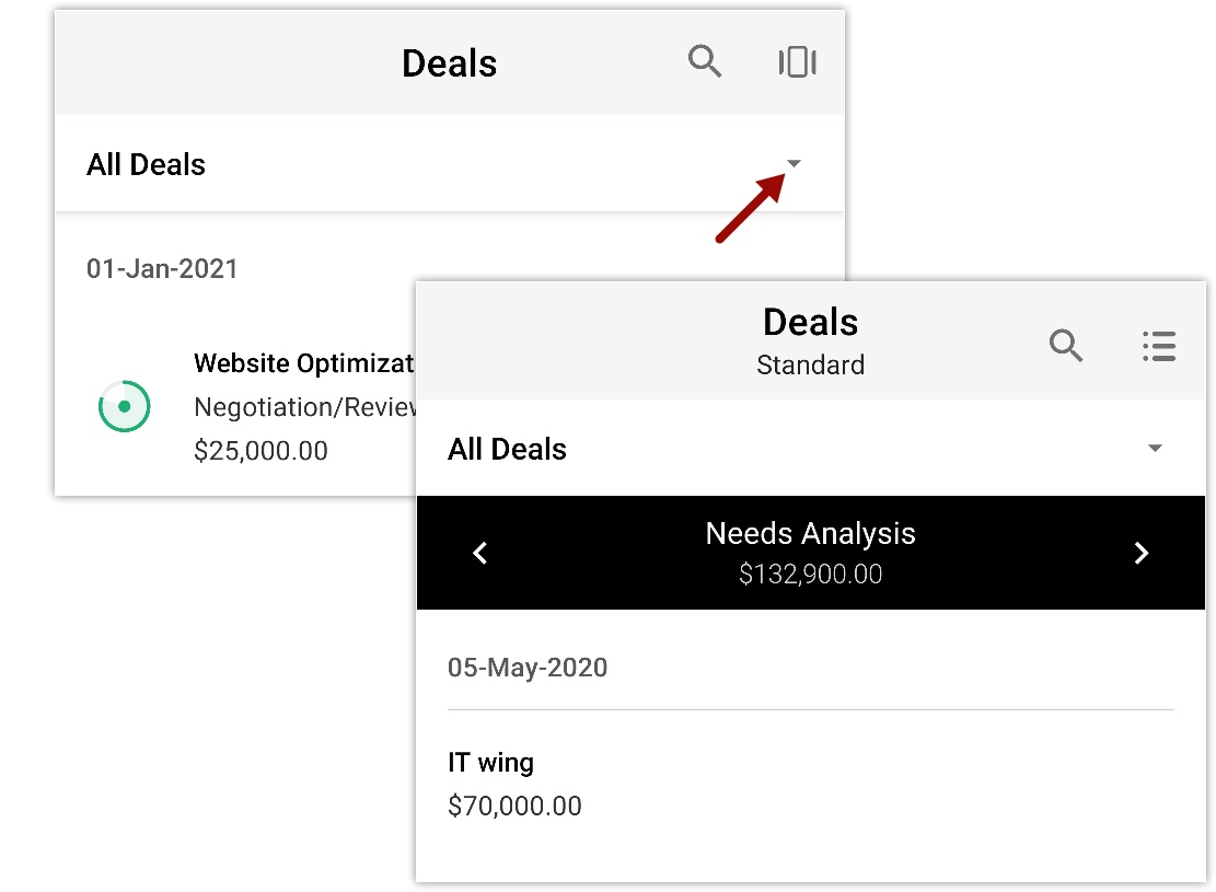 销售管道视图会根据商机阶段分类记录。这仅在“商机”模块中可用 如要查看销售管道中的商机,请执行以下操作 在“商机”模块中,点击销售管道图标。 点击箭头以查看每个阶段中的记录。