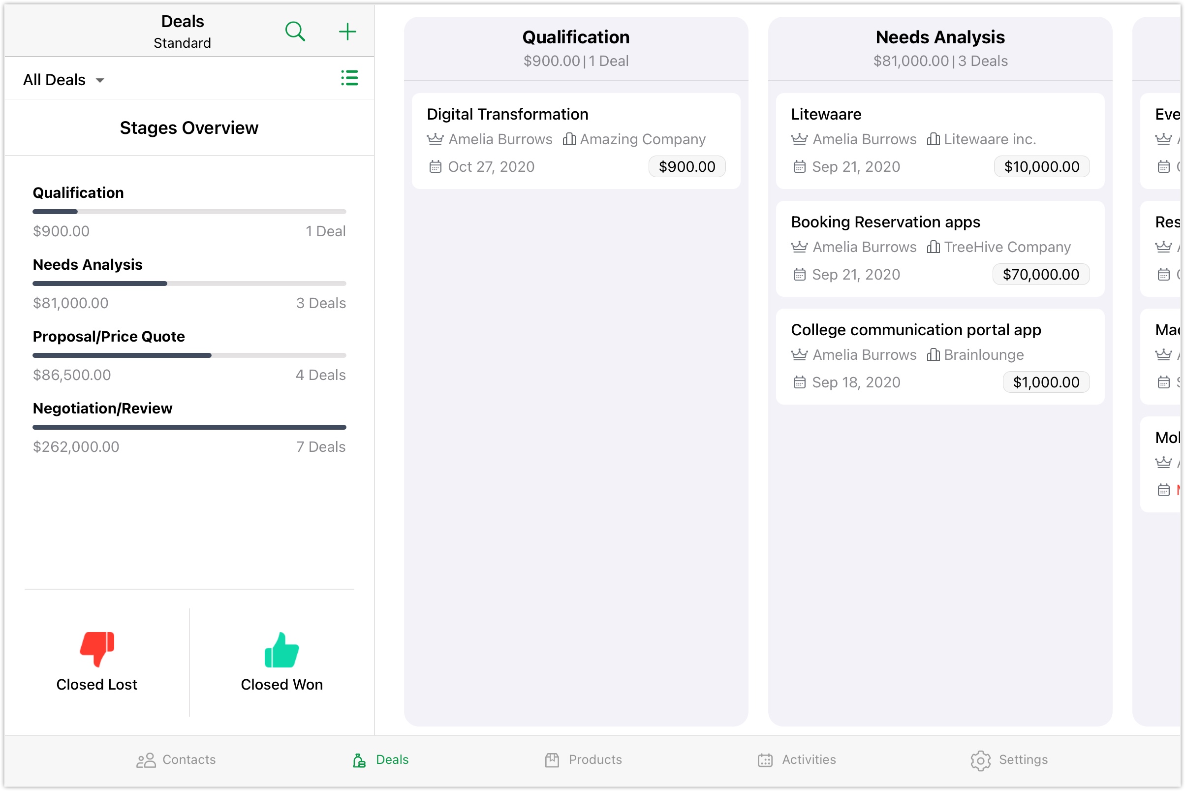 销售管道视图会根据商机阶段分类记录。这仅在“商机”模块中可用