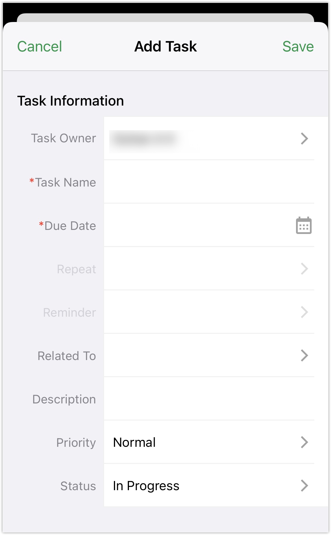 对于 Bigin 移动应用程序中的每个记录,您可以创建任务、通话、活动、商机,还可以关联备注和文件。您可以关联的项目取决于所选的模块。例如,在“产品”模块中,您只能关联商机和文件。 转到所需的模块,然后点击要为其添加任务、活动、备注、通话等的记录。 轻触添加图标。 选择您要添加的记录类型:备注、任务、活动、通话、文件 对于备注、任务、活动和通话,请指定详细信息,然后点击保存。