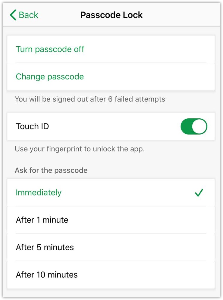 - 在要求密码部分下,针对在打开应用后何时提示用户输入密码选择选项。