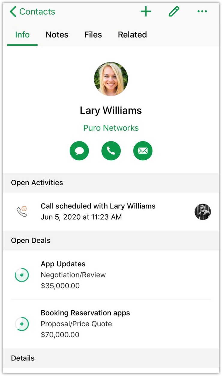 • 信息页签 - 显示有关记录的所有可用信息,例如名称、电子邮件、电话等。