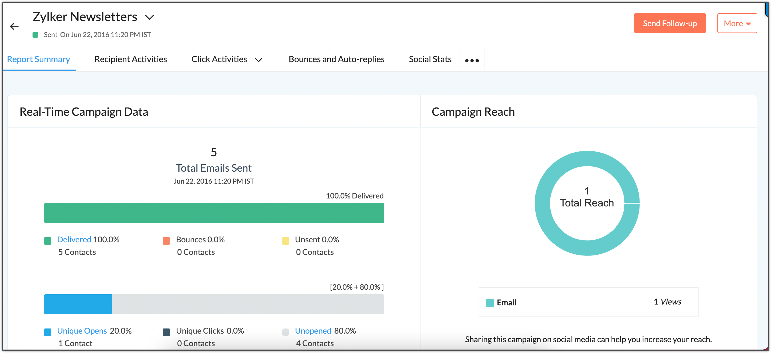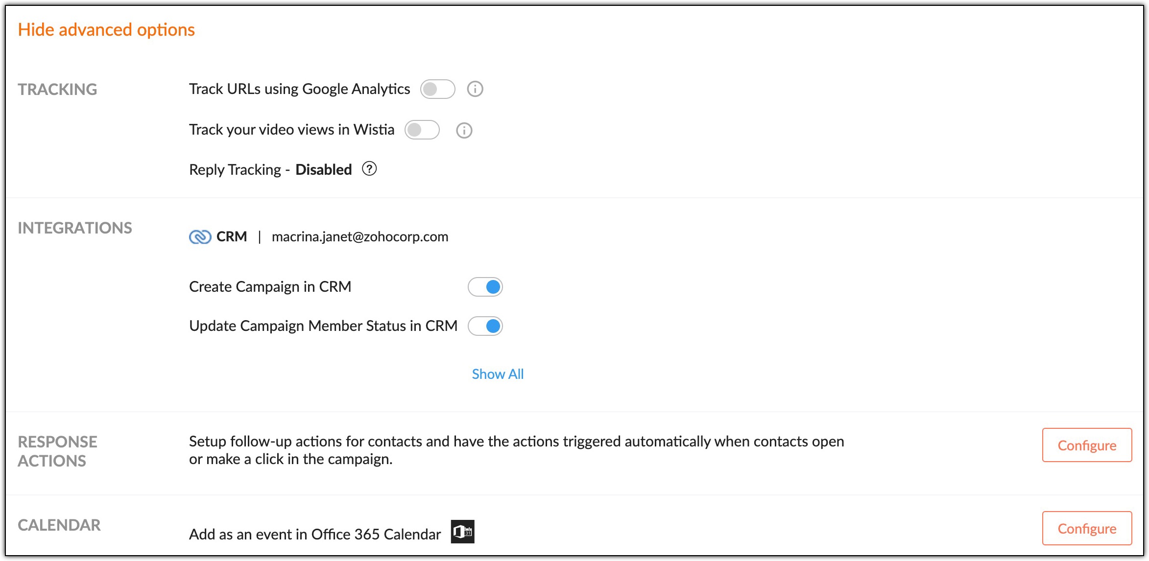 - 回复跟踪-使用回复跟踪功能,您可以记录收到的营销活动回复。默认情况下,对所有电子邮件活动禁用回复跟踪。您可以在创建活动时为活动启用回复跟踪。打开此选项将帮助您为您的联系人生成专用的回复地址,这反过来将帮助您跟踪他们的回复。