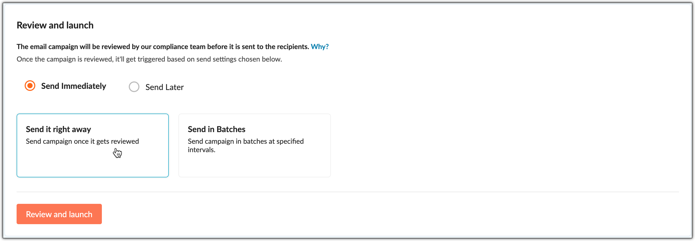 在启动电子邮件营销活动之前,请使用 “查看并启动” 选项确保电子邮件营销活动到达收件人的收件箱,而不是垃圾邮件文件夹。我们的合规团队将检查您的主题行、邮件列表和内容是否符合反垃圾邮件。