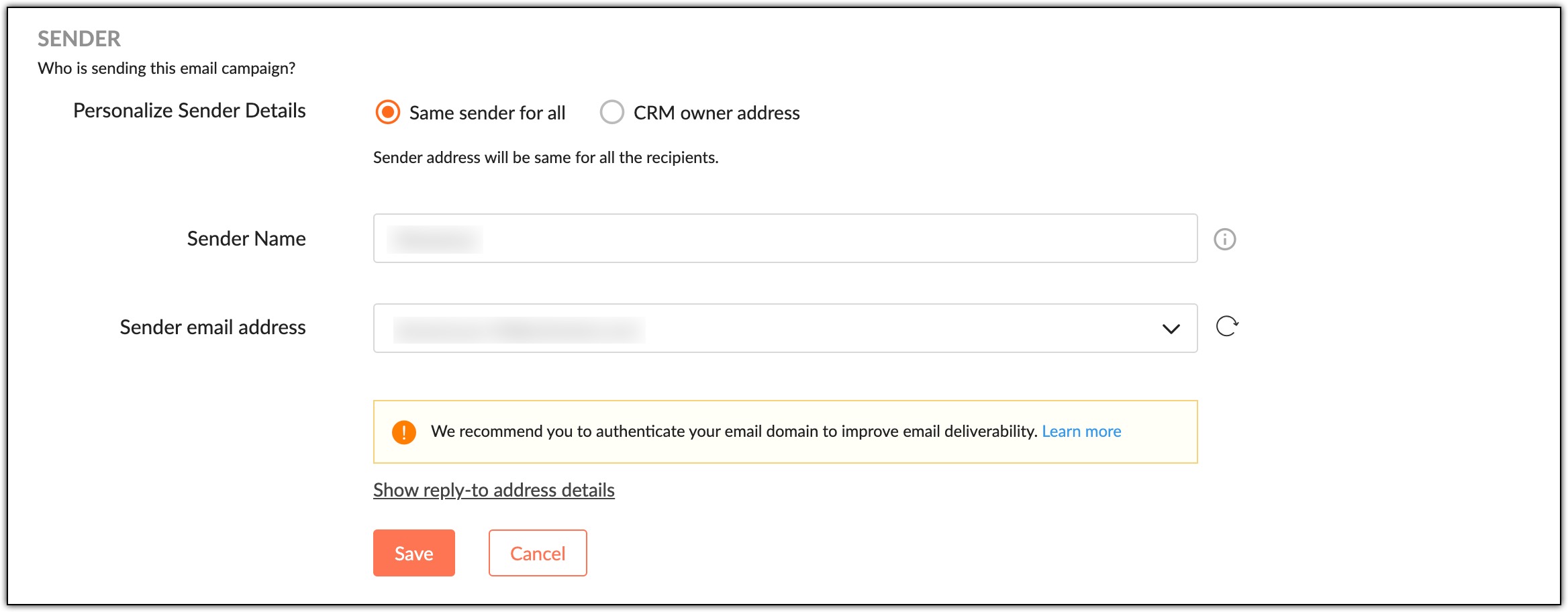 - 个性化发件人详细信息- 您可以通过选择以下任一选项来配置电子邮件营销活动的发件人详细信息: 所有发件人相同,基于自定义字段和CRM所有者地址。