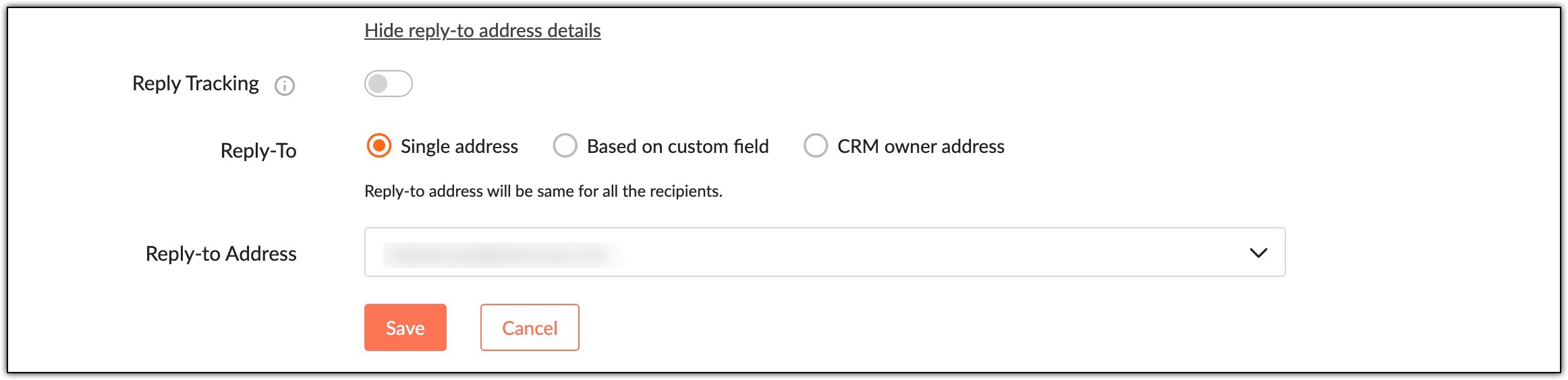 1.回复-至 -本节将帮助您根据您选择的以下选项之一收集联系人的回复: 单个地址,基于自定义字段和CRM所有者地址 (如果收件人是从Zoho CRM导入的,您可以基于CRM中拥有该账户的用户个性化发件人姓名)。