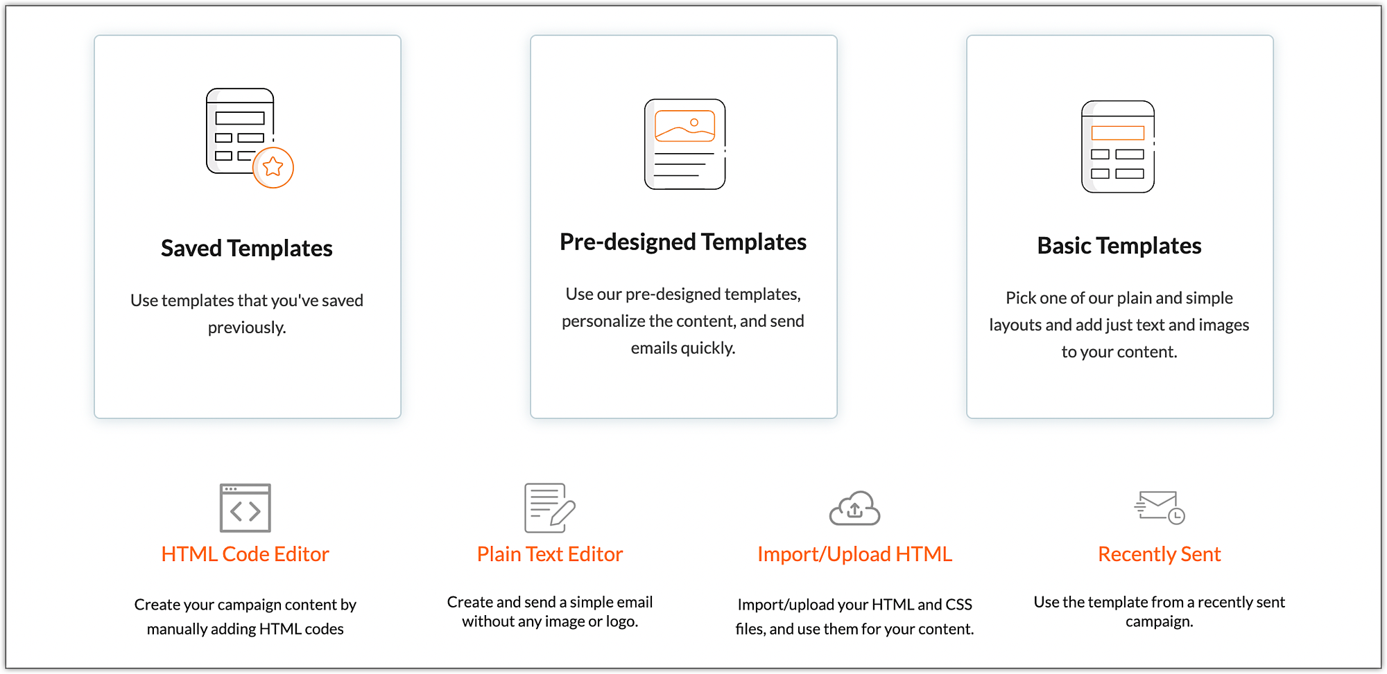 Zoho Campaigns提供了一些预先设计的电子邮件模板供您使用。只需选择一个满足您需求的电子邮件模板,然后进行一些修改以使其个性化以适应您公司的需求。