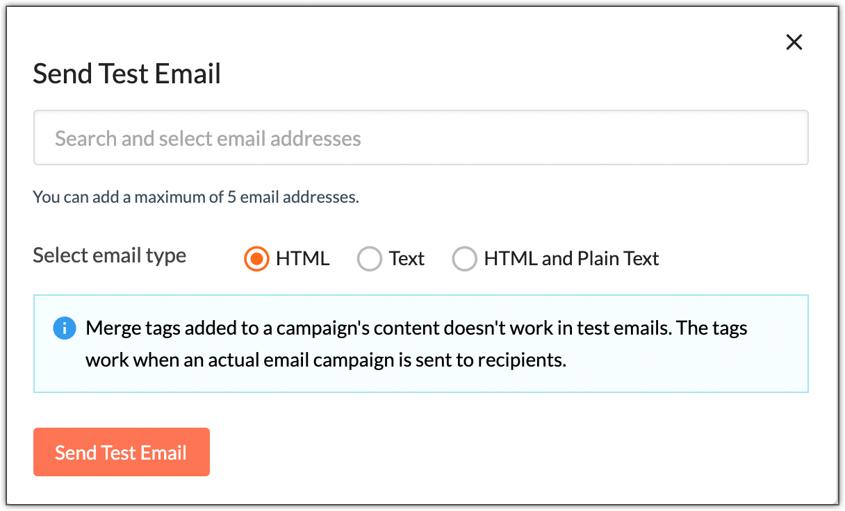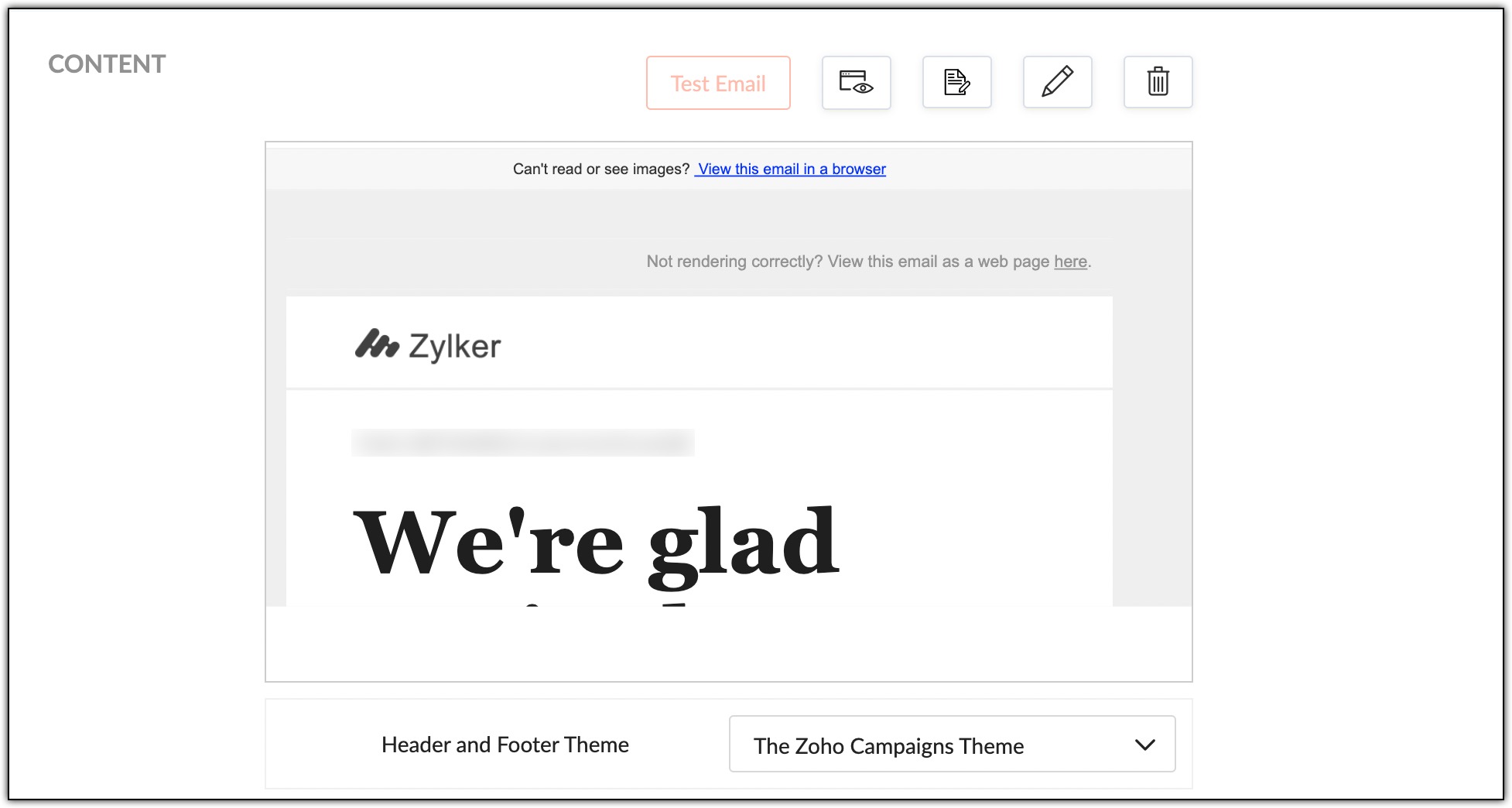 在向订阅者发送电子邮件之前,请多次大声朗读。然后,将测试电子邮件发送给您的一些同事进行审核。要求他们校对电子邮件,检查语法错误,对齐问题和测试链接,以验证它们是否被重定向到正确的页面。这是Zoho Campaigns中的预览和测试功能将帮助您的。