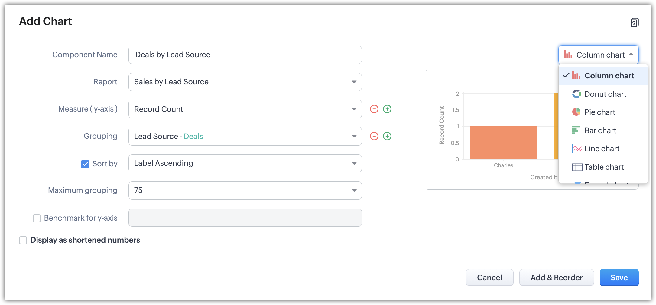 当所选分组为选择列表或数字字段时,此选项可用。了解更多。 - 点击更多选项以选择排序方式、最大分组、y 轴基准以及以缩短的数字显示。