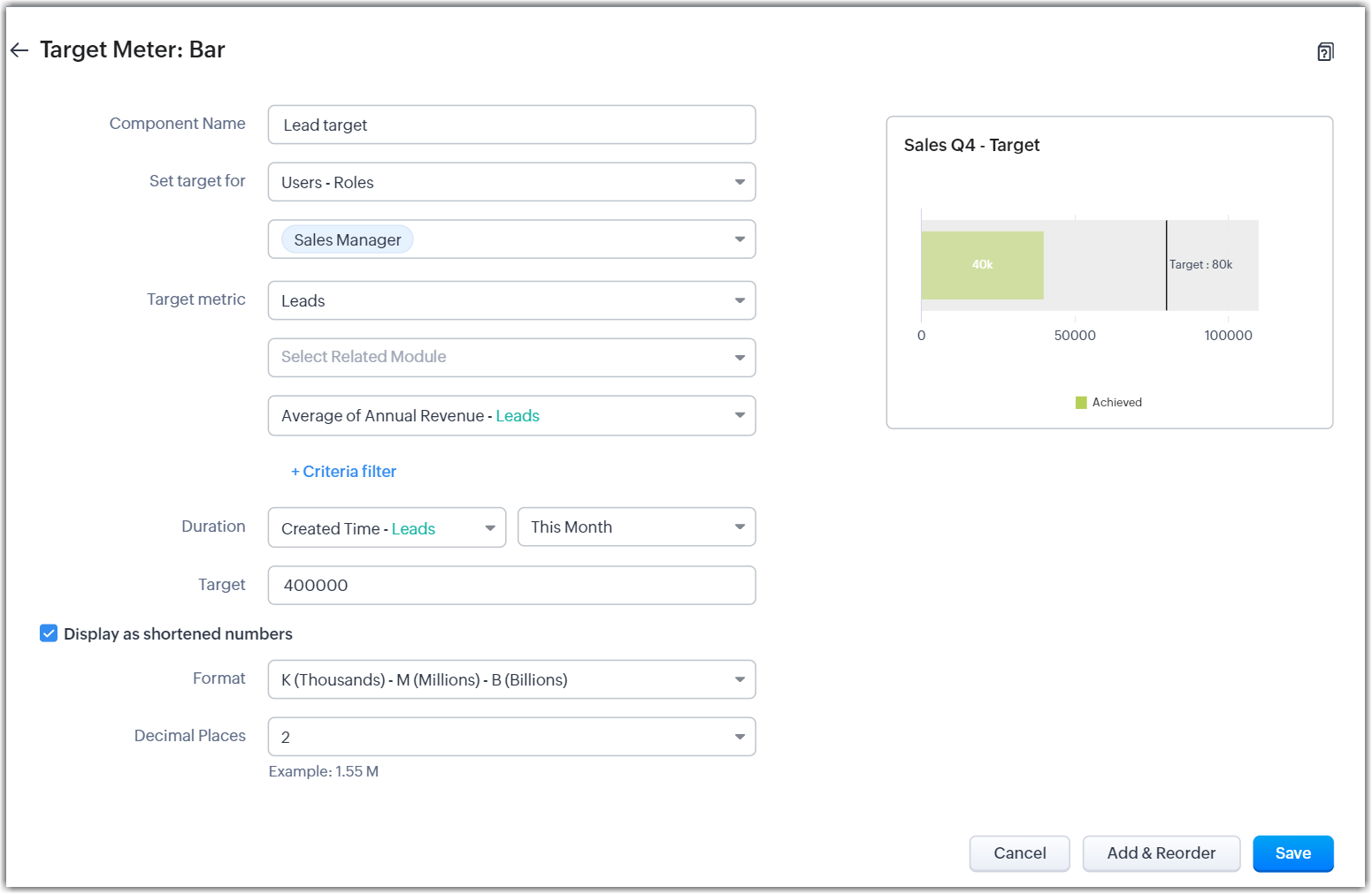 Zoho CRM 为用户仪表板提供不同类型的数据深度分析组件。用户可以选择的组件列表如下: 图表 - 图表是用户数据的图形表示。它为轻松分析提供了快速洞察。我们支持柱状图、水平图、折线图、堆叠图、饼图、环形图、表格图、漏斗图和面积图。 KPI - 关键绩效指标允许用户衡量其团队的表现。我们支持标准、增长指数、基础、记分卡和排名 KPI。 比较器 - 比较器为用户提供任何数据的比较概览,包括用户表现、线索来源等。 异常检测器 - 异常检测器检测用户常规业务流程中的任何异常。 目标表 - ...