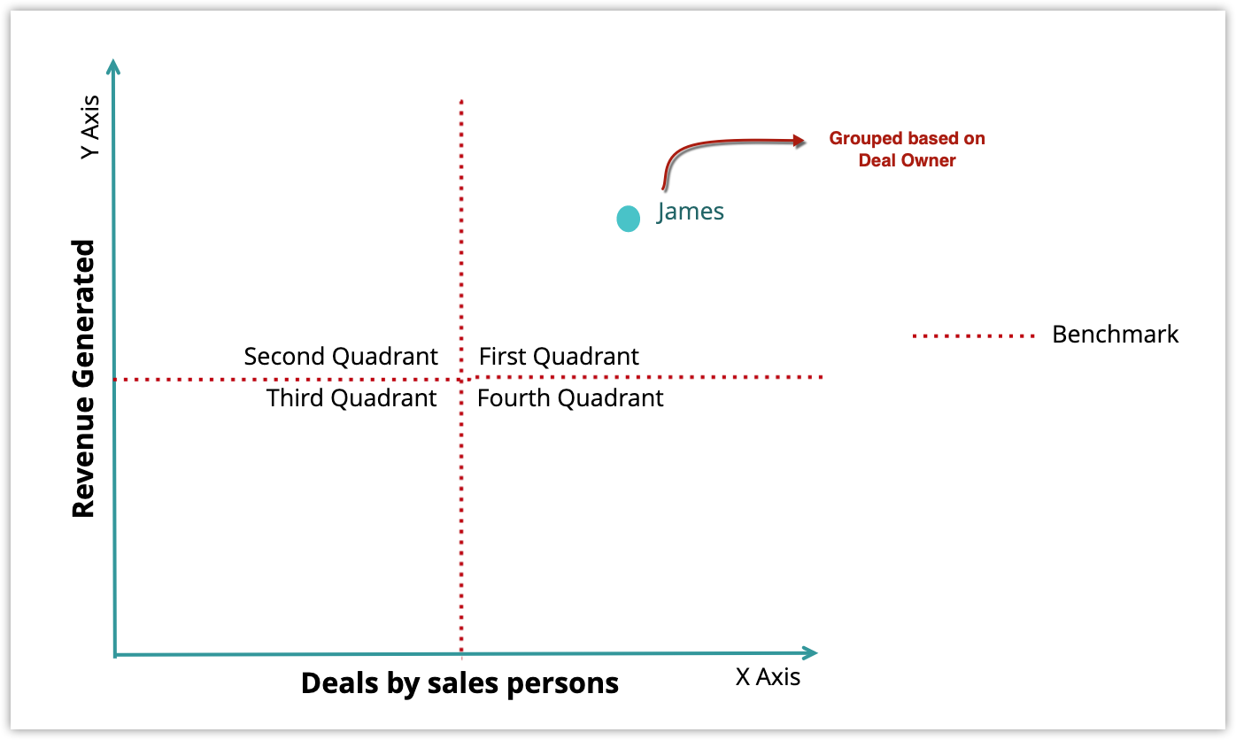 例如,您正在创建一个象限分析,以查看不同销售人员的商机 vs 产生的收入。定义完所有组件后,将在适当的象限中展示数据。
