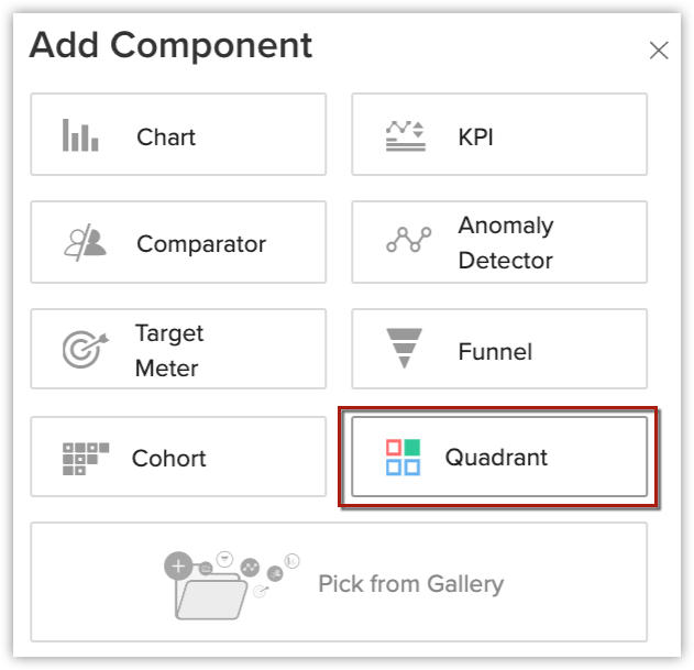 Zia 的高级推荐可用于构建您的分析仪表板的各个元素。这些推荐是通过检查用户的报表和图表产生的。Zia 将分析您的数据,并为与您的组织需求和业务流程相匹配的象限分析组件提供一流的建议。