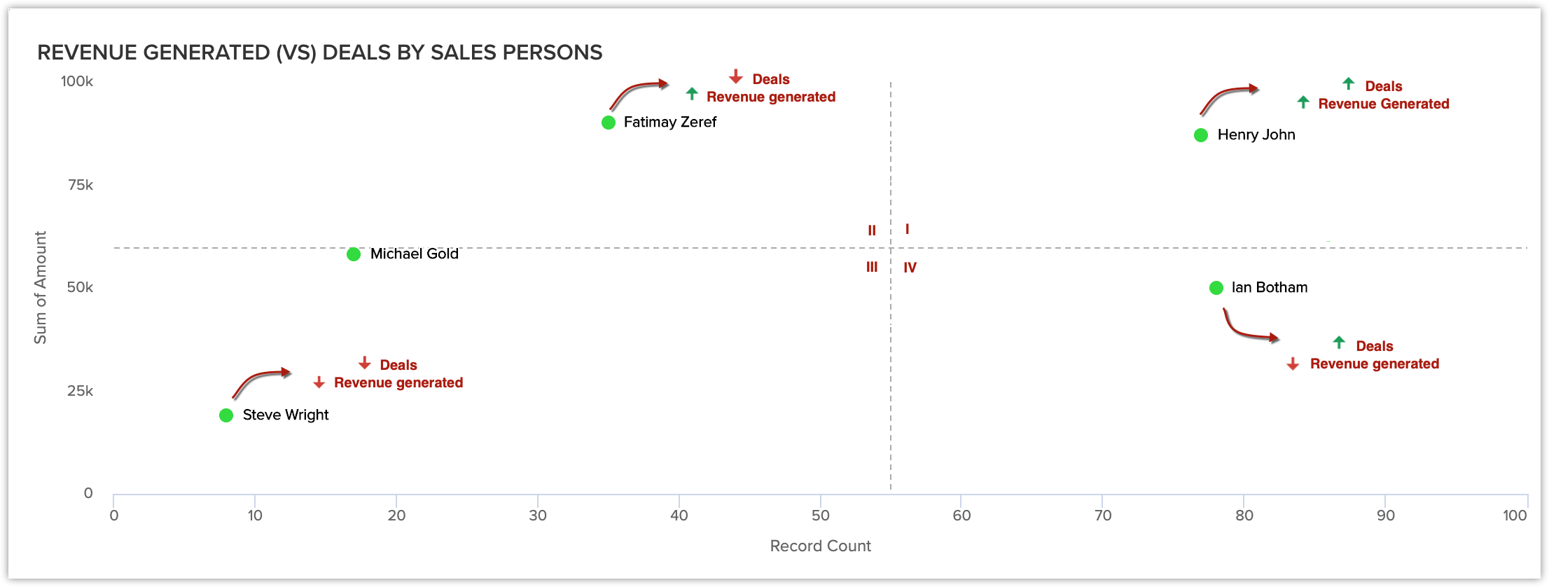 - Steve Wrigh 的商机数量更少,产生的收入也更少。他位于第三象限。