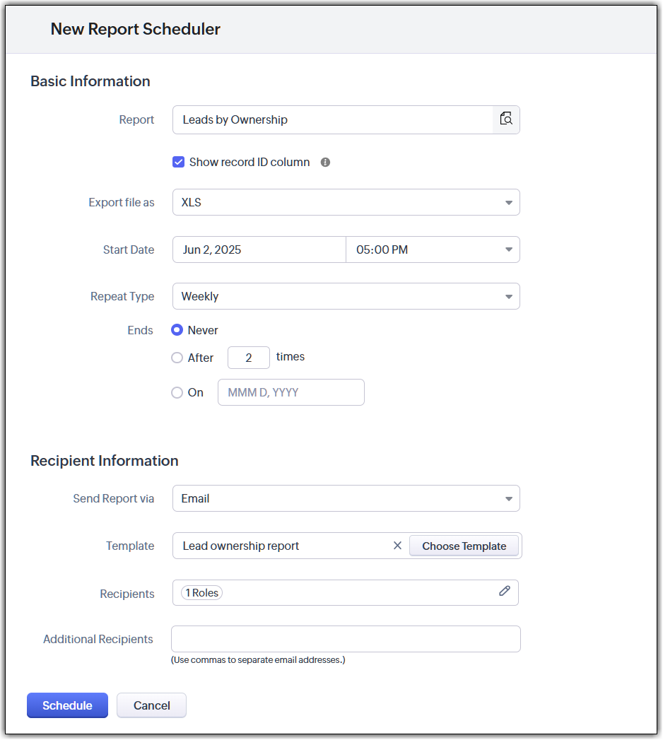 您可以安排每日/周/月/年自动发送报表给同事、高级管理层和非 Zoho CRM 用户。一旦配置了计划报表,指定的报表就会以电子邮件附件(XLS 格式)的形式发送给收件人。