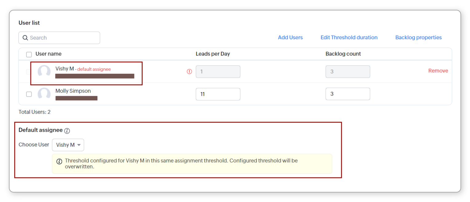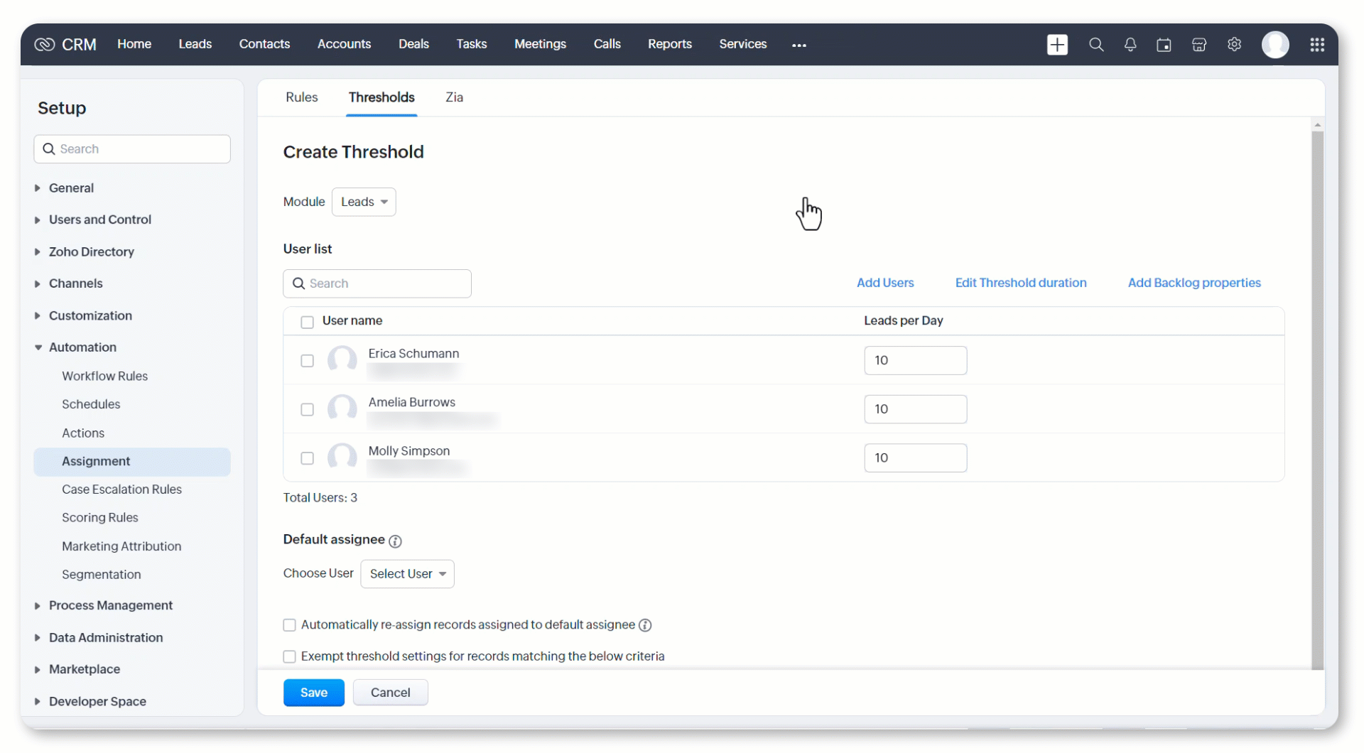 备注 : 如果用户被设置为阈值的默认被分配人,则无法在该模块中为该用户设置阈值,确保对默认被分派人的记录数没有限制。
