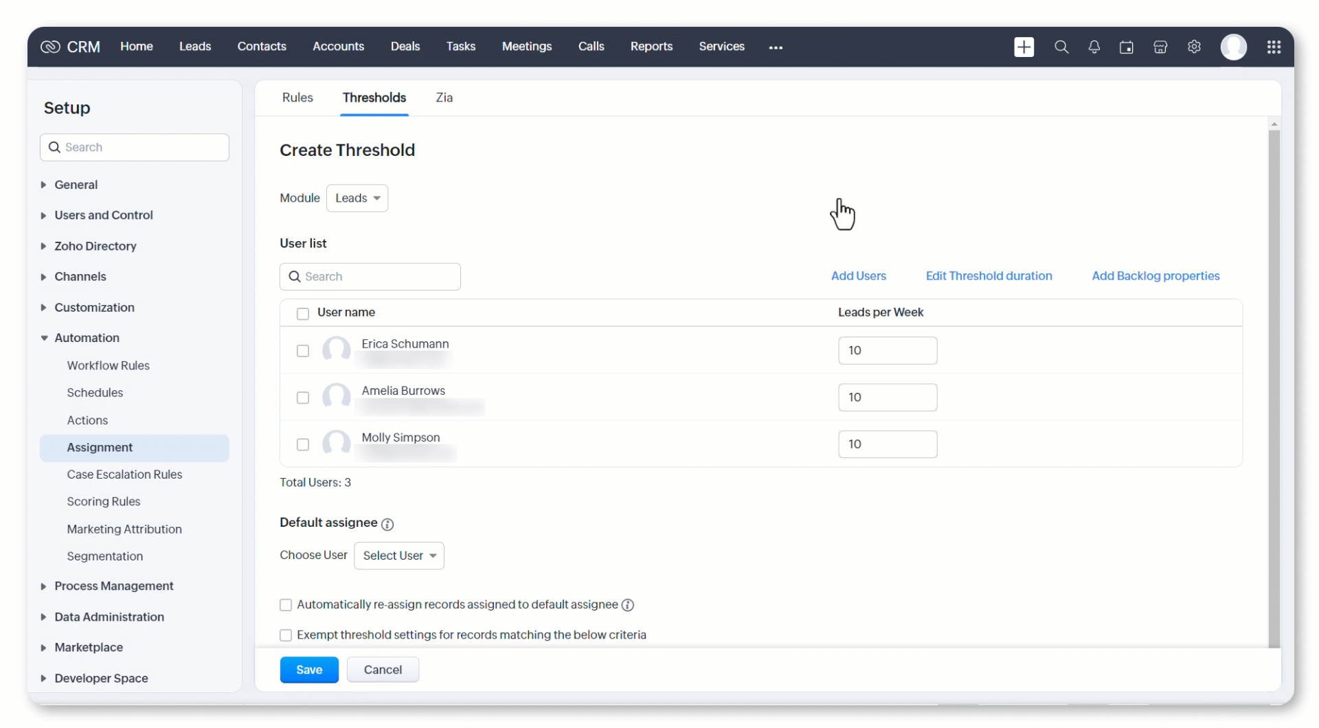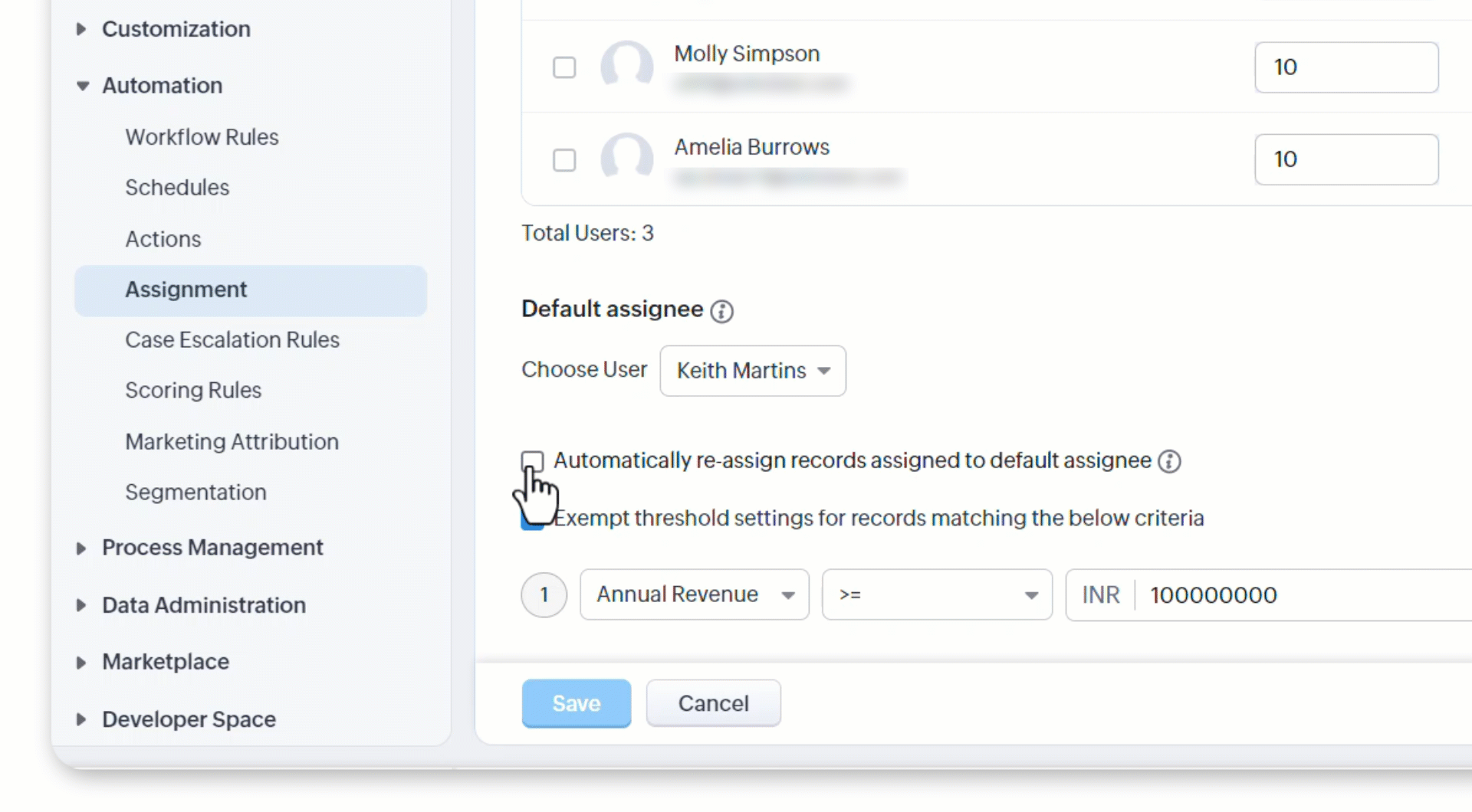 创建阈值时,勾选自动重新分配那些已分配给默认被分配人的记录。