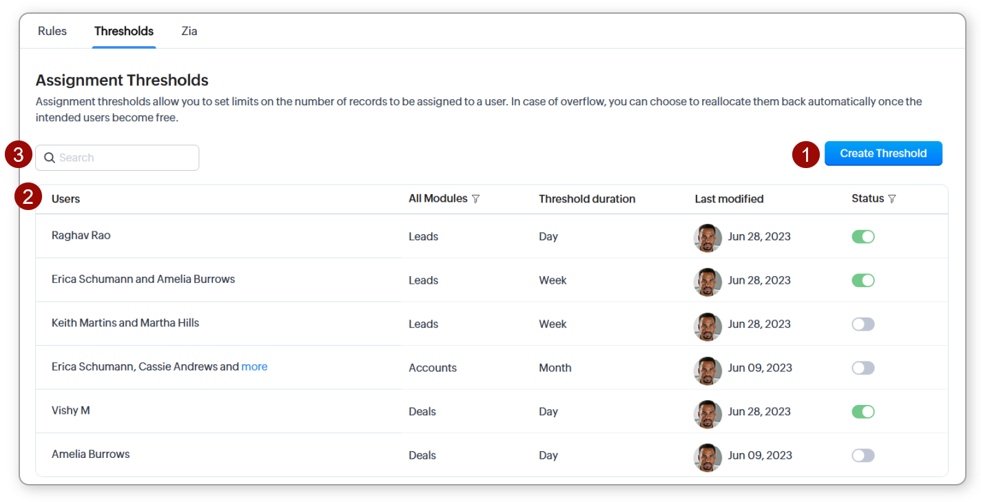 - 阈值表: 这将列出CRM中的所有阈值。使用此选项可访问以下详细信息: