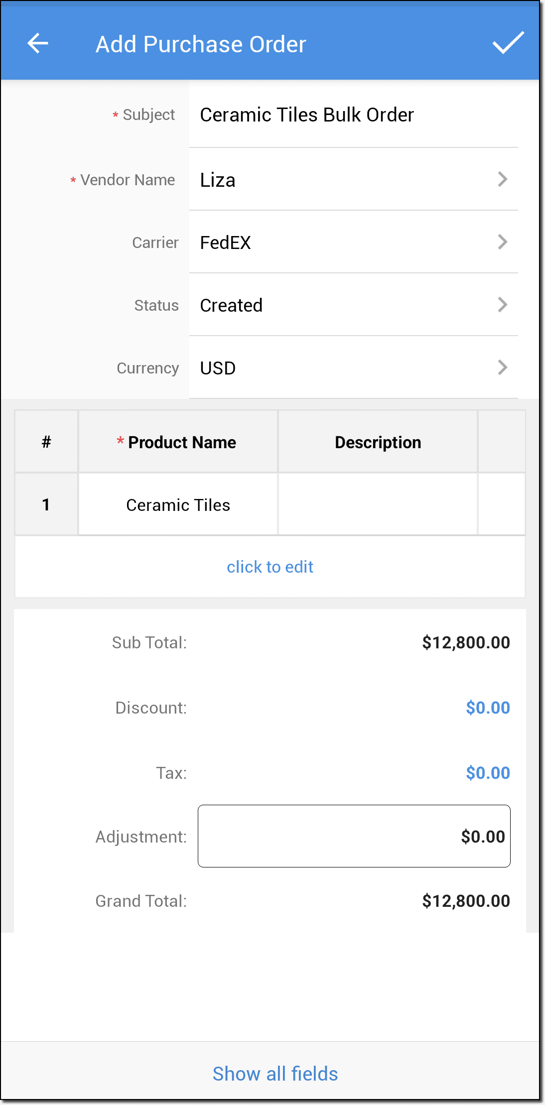 图标,在添加采购订单页面中输入详细信息。要查看所有销售订单字段,请点击显示所有字段。