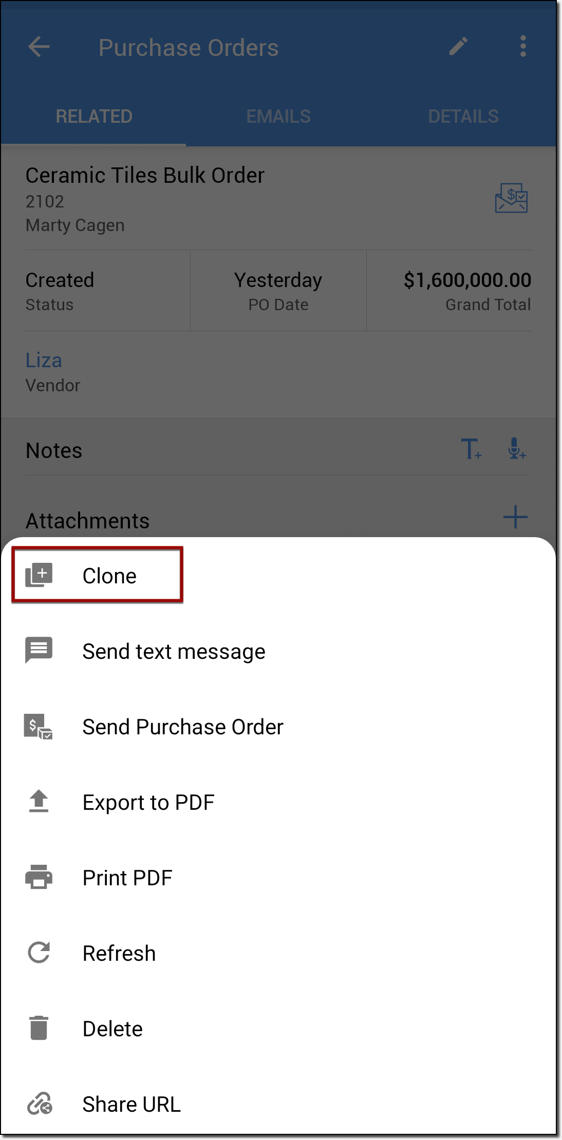 您只能在安卓应用中通过手动在采购订单详情表单中输入数据来创建销售订单。