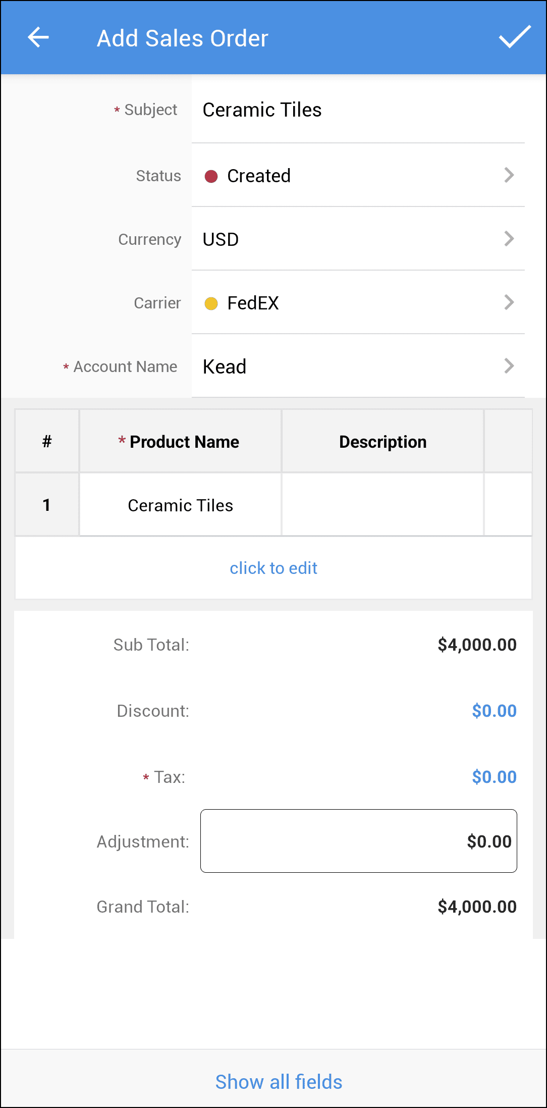 图标,在“添加销售订单”页面输入详细信息。要查看所有销售订单字段,请点击“显示所有字段”。