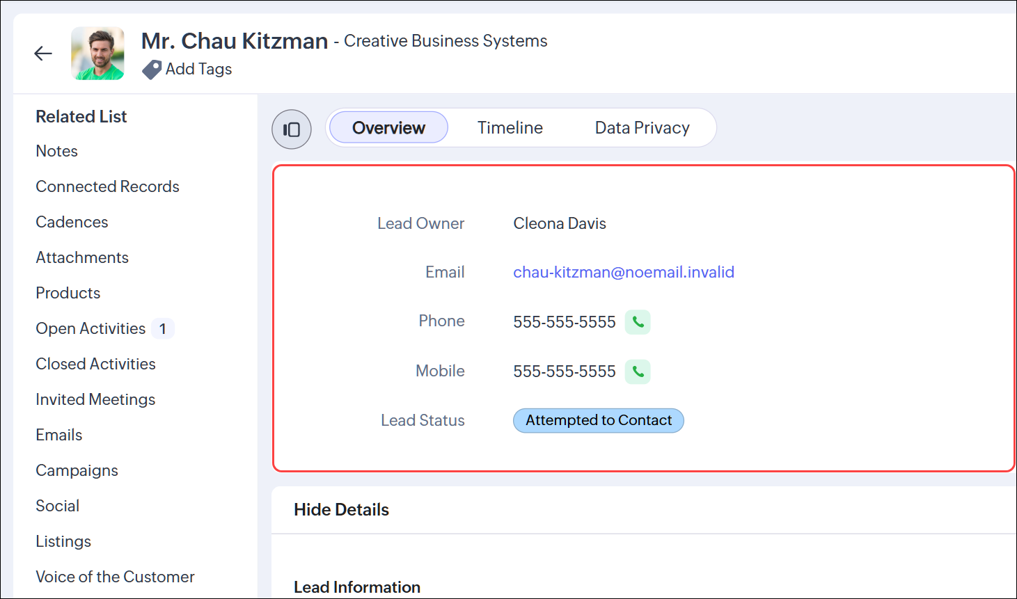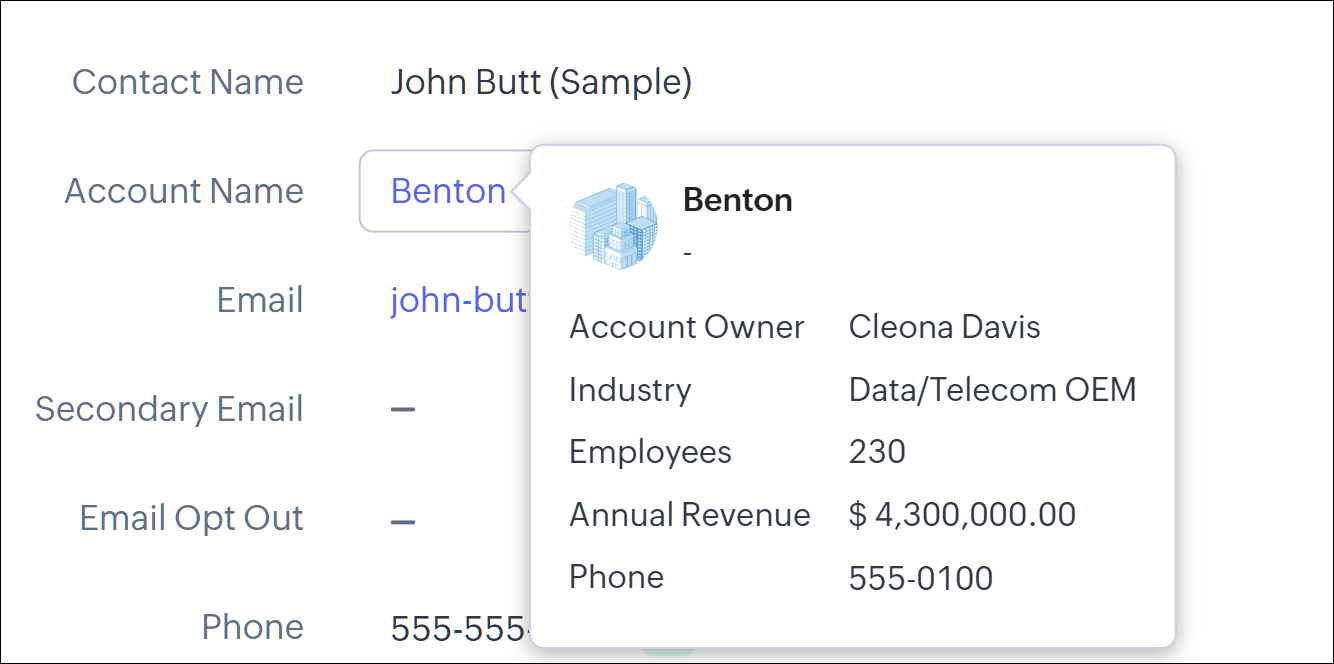 “记录详情”页面中的“名片”视图提供了诸如记录所有者、电子邮件地址、电话号码等详情的快速预览。有时,客户在与客户通话或共享时可能需要在名片中查找更多信息。为此,您应能够选择必须对客户可见的字段。因此,我们允许根据您的需要定制名片。