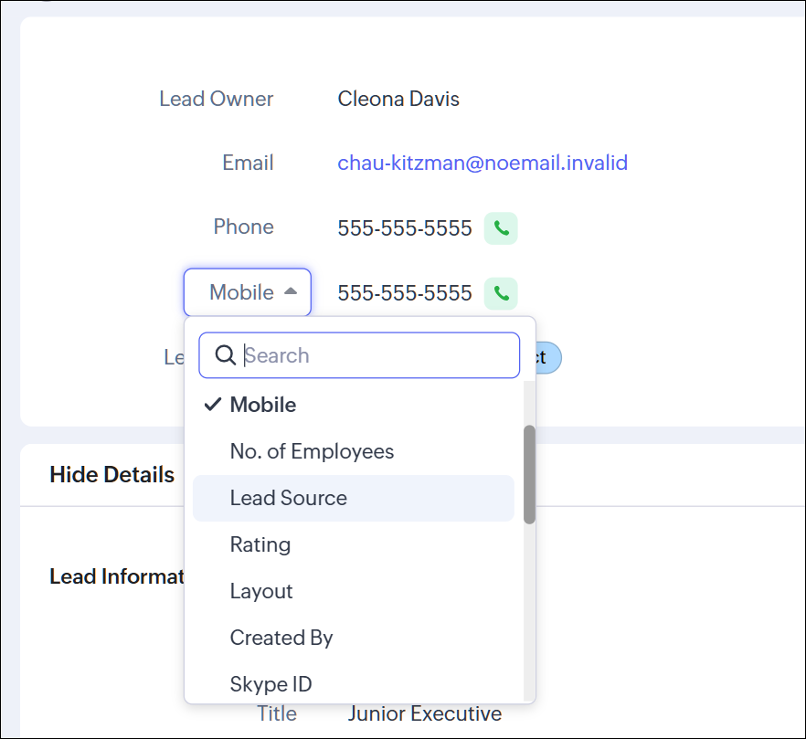 您可以直接在记录详情页面替换名片中的字段。将鼠标悬停在字段上,点击向下箭头从列表中选择所需字段。