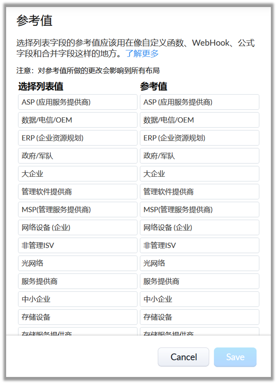 例如,如果选择列表字段“线索来源”中的选项之一“广告”被翻译为 10 种不同的语言,那么对于在 CRM 中使用不同语言的用户,该函数将无法使用相同的“广告”值。为解决此问题,我们引入了参考值。每个选择列表字段由一个参考值(它在每种语言中是通用的)表示。定义涉及选择列表字段的任意以上函数时,用户只能使用参考值以运行函数。