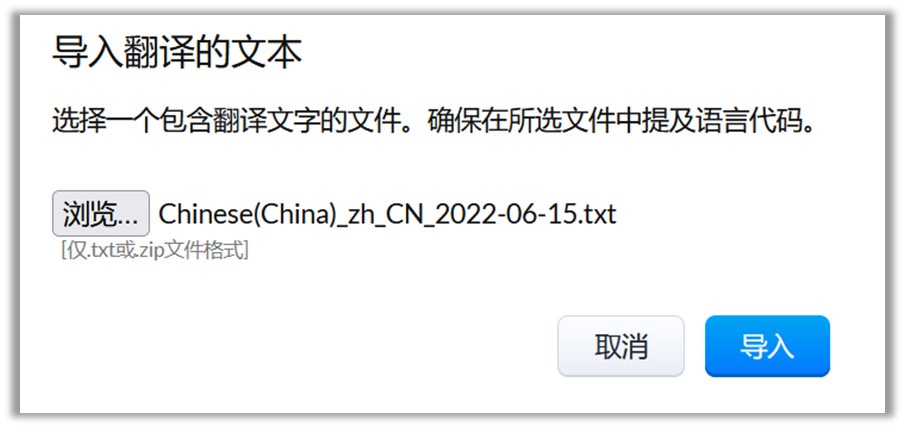 - 在 导入翻译的文本 弹出窗口中,浏览并选择已下载并进行了翻译的文件。