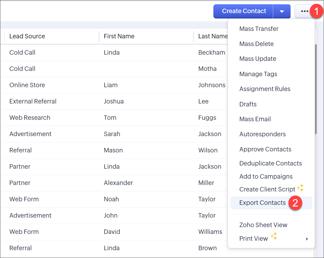 Zoho CRM 中有三个与导出相关的选项: