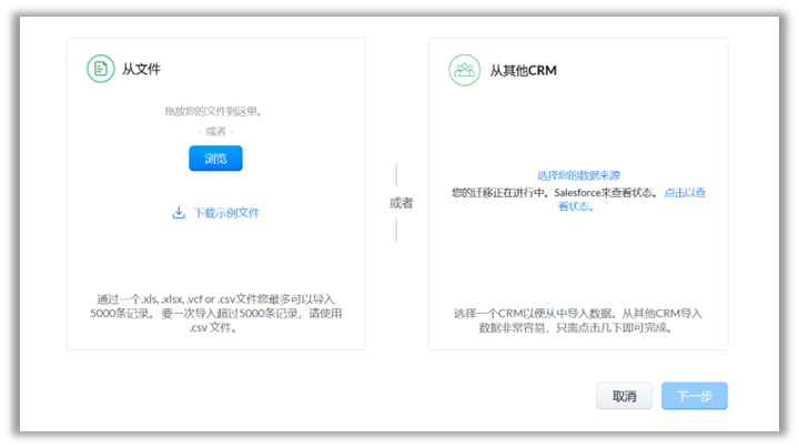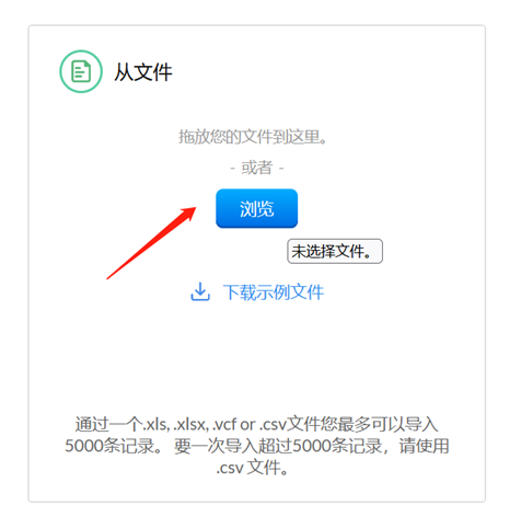 如果导入文件为 XLS、XLSX 或 VCF 格式,则最多可以导入 5000 个记录/批。但是,要导入超过 5000 条记录/批次,您的导入文件必须仅是 .CSV 格式,并且您可以导入的最大记录数将根据您的订阅而有所不同。