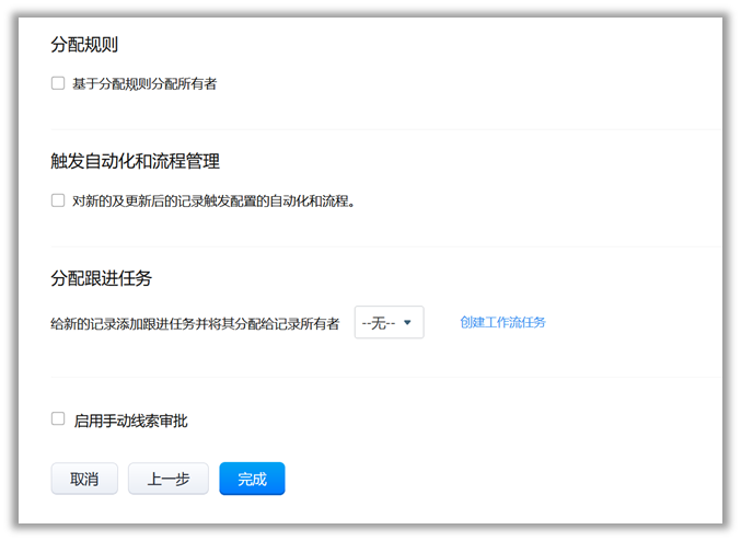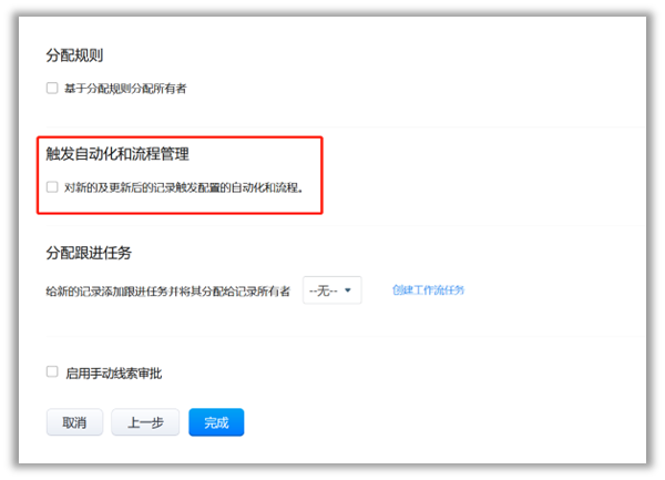 只有在导入文件中少于10,000行的情况下,才会显示触发器自动化和流程管理选项。如果无法查看该选项,说明导入文件超过了10,000行。