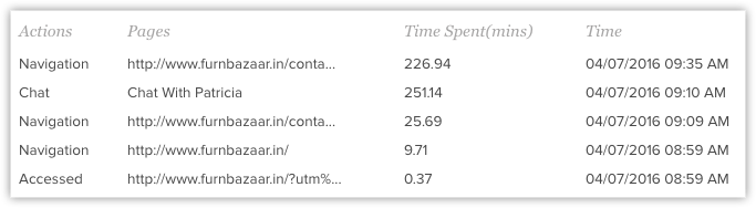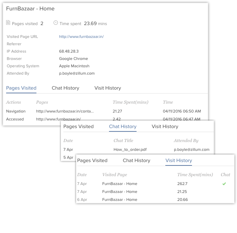 当访客访问你的网站并提供姓名和电子邮件地址与销售代表聊天时,访客的详细信息将作为访问页签的条目被捕获。如在网页上花费的时间、访问过的网页、IP地址、访问者的姓名等。