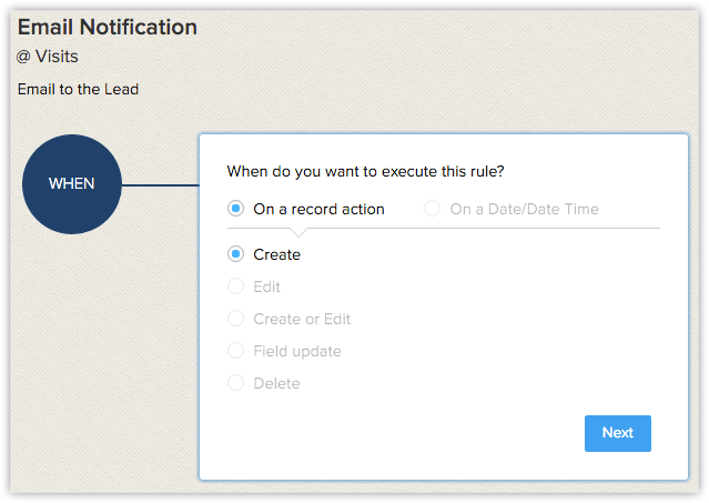可以在访问创建时配置工作流规则。例如,访问创建后,您可能希望自动向相关线索发送邮件。这时,您可以为访问模块配置工作流规则。