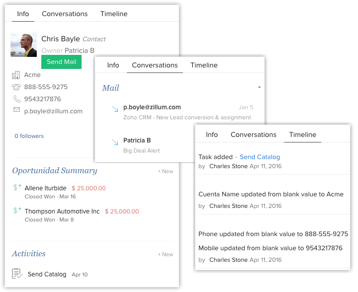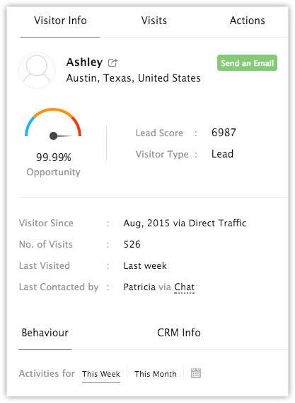 CRM视图提供与访客相关的所有详情整体视图。您可以检查CRM中已有的访客详情,查看聊天历史,访问详情,邮件来往,商机摘要,活动,备注等等。