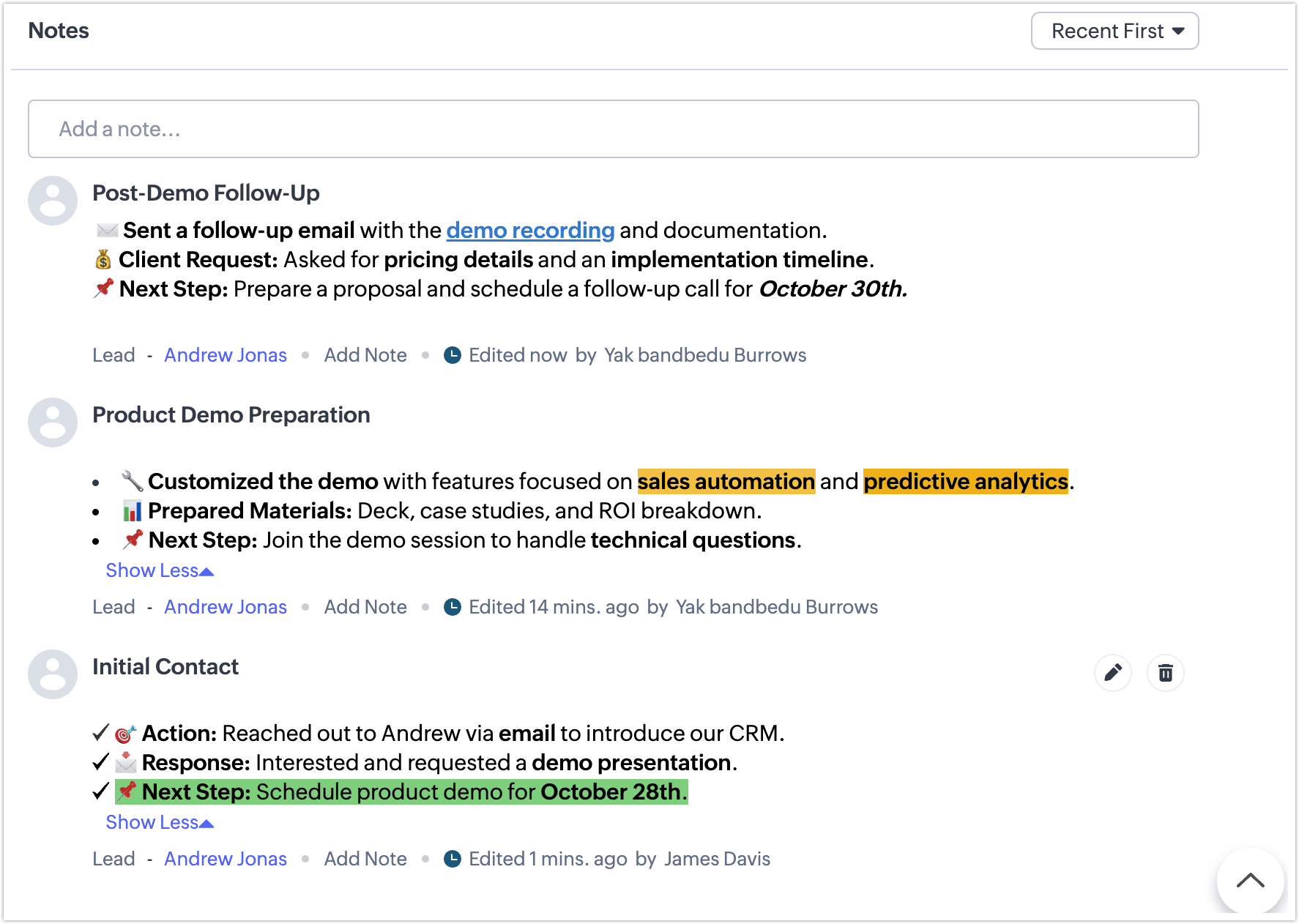 有时候,您可能需要从 Zoho CRM 系统中移除一些不必要的备注以获得更好的用户体验。 您可以考虑删除对未来参考无用的备注。