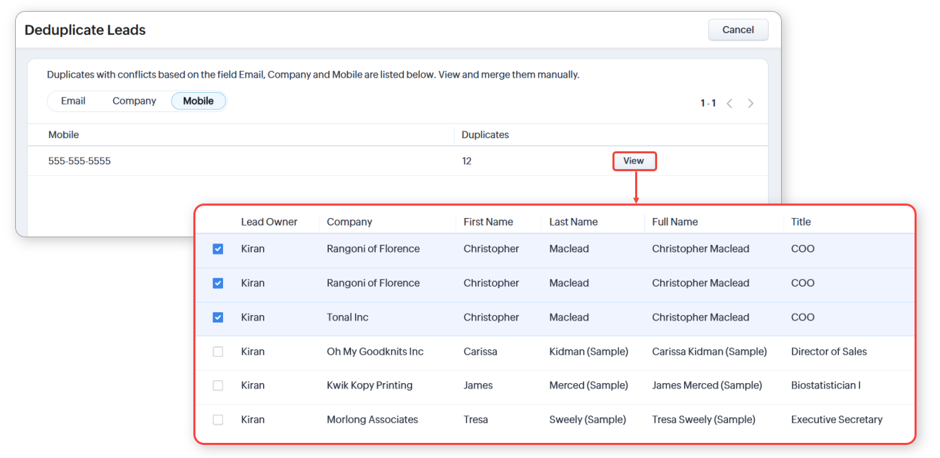 - 根据以上示例,有两个线索带有相同字段值,电话号码除外。因此在“删除重复的线索记录”页,您可以看到记录已列示为列。