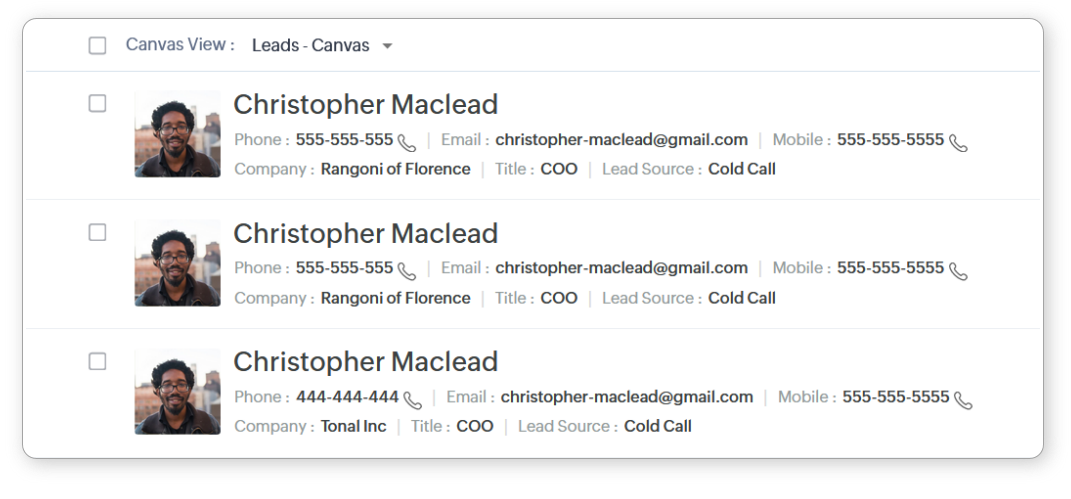 考虑下图。有两个完全匹配的记录,还有一个只有电话号码和公司字段不同的记录。在这种情况下,CRM 将自动合并前两个记录,并提示用户解决最后一个记录的冲突。解决冲突后,记录将被合并。