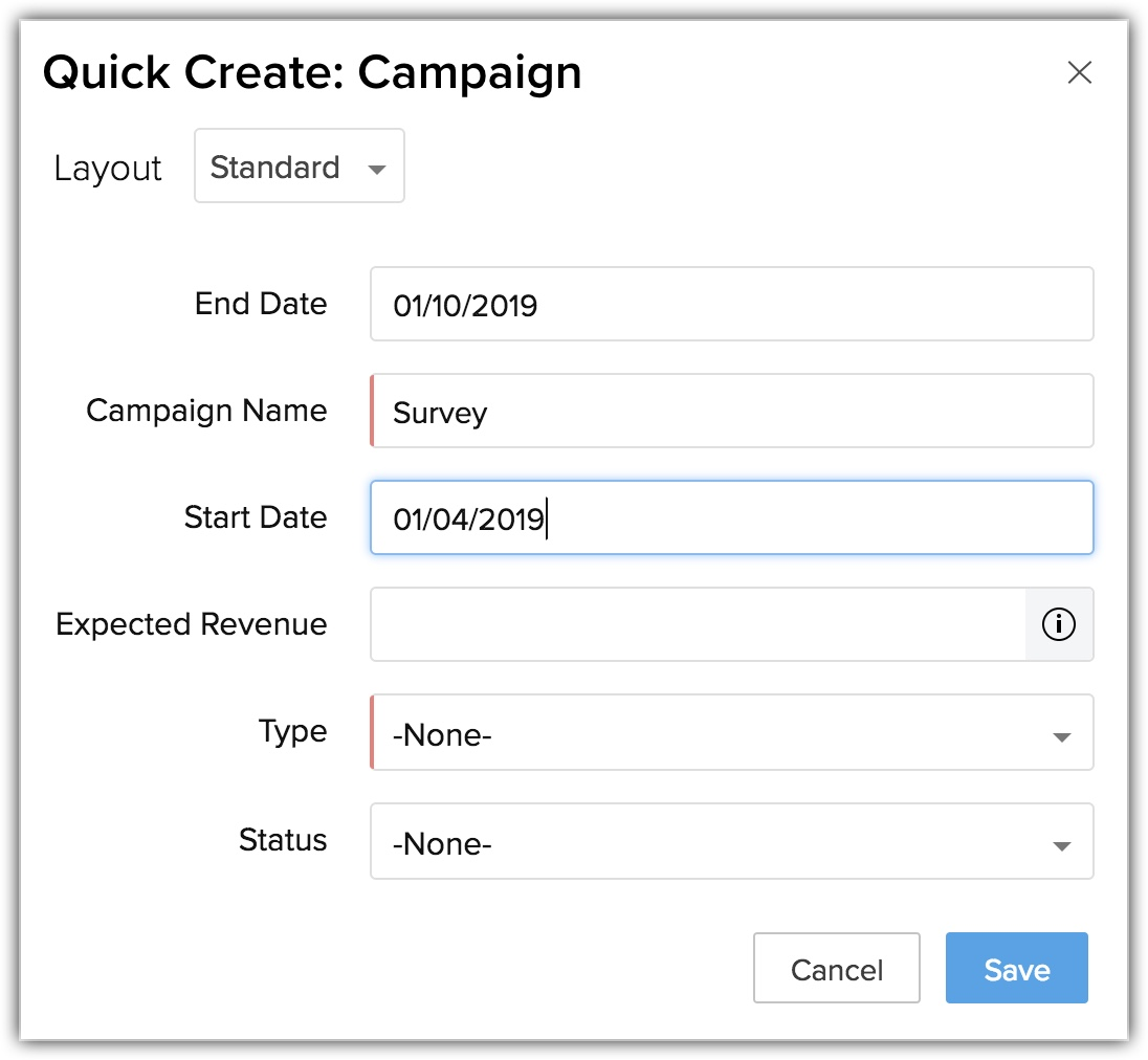 名为类型 的列代表 Zoho CRM 中创建的市场活动的类型,例如,网络研讨会、展会、电子邮件等等。