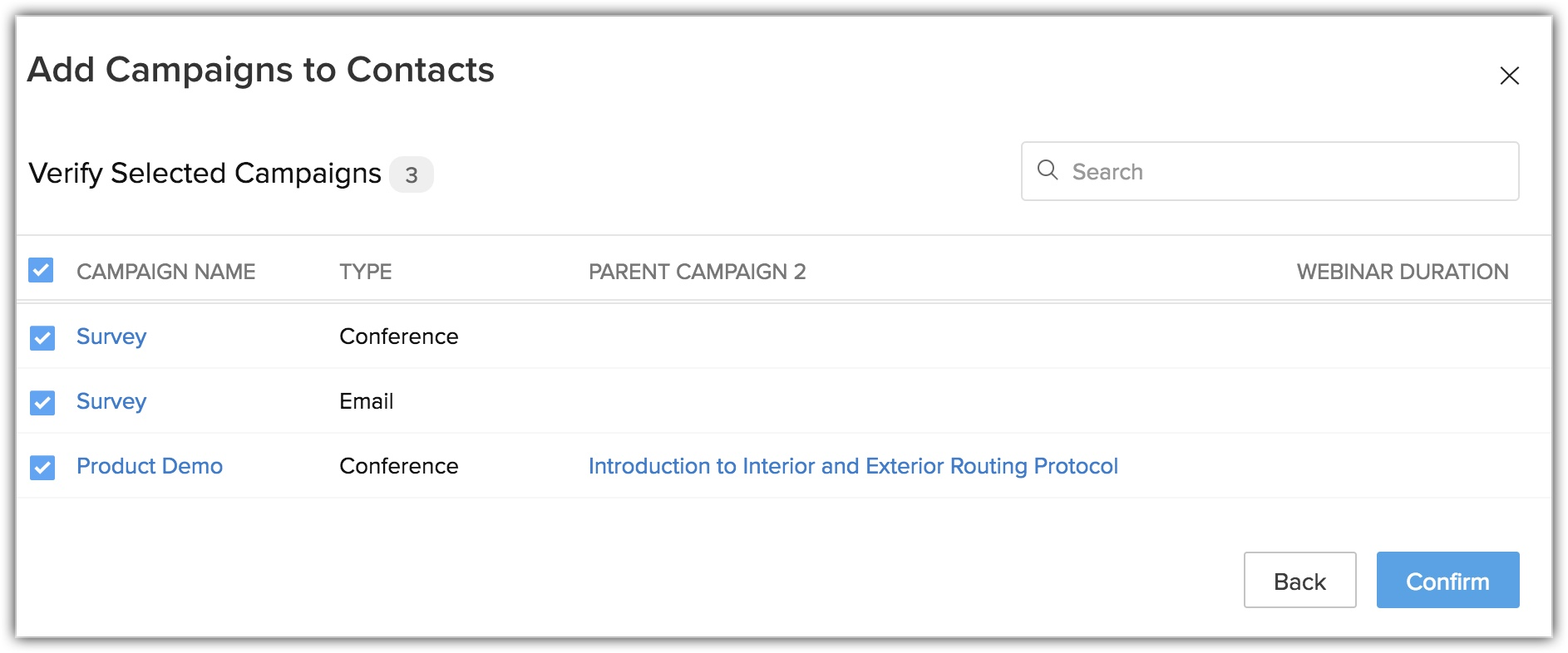 Zoho CRM可以让您将一系列市场活动作为子市场活动与第一个或父市场活动相关联。这使您能够跟踪机构开展的连续活动的参与者。