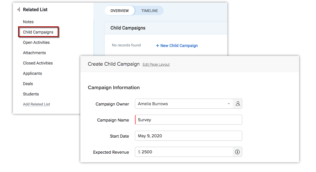 - 从相关列表 -一旦在Zoho CRM中创建了父市场活动,相关列表项将自动显示子市场活动选项。您可以创建一个新的子市场活动,它将与父记录相关联。