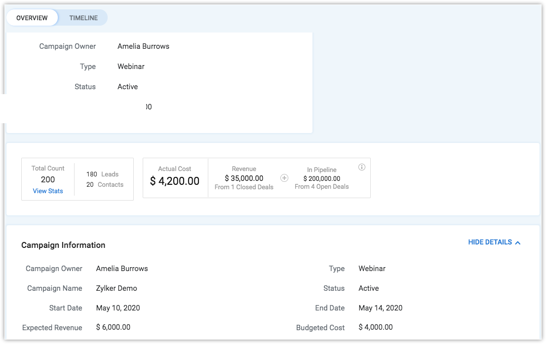 在市场活动 页面中,您将能够查看与此市场活动相关联的线索和联系人的总数、跟踪此市场活动的成本和收益明细及查看其它信息。