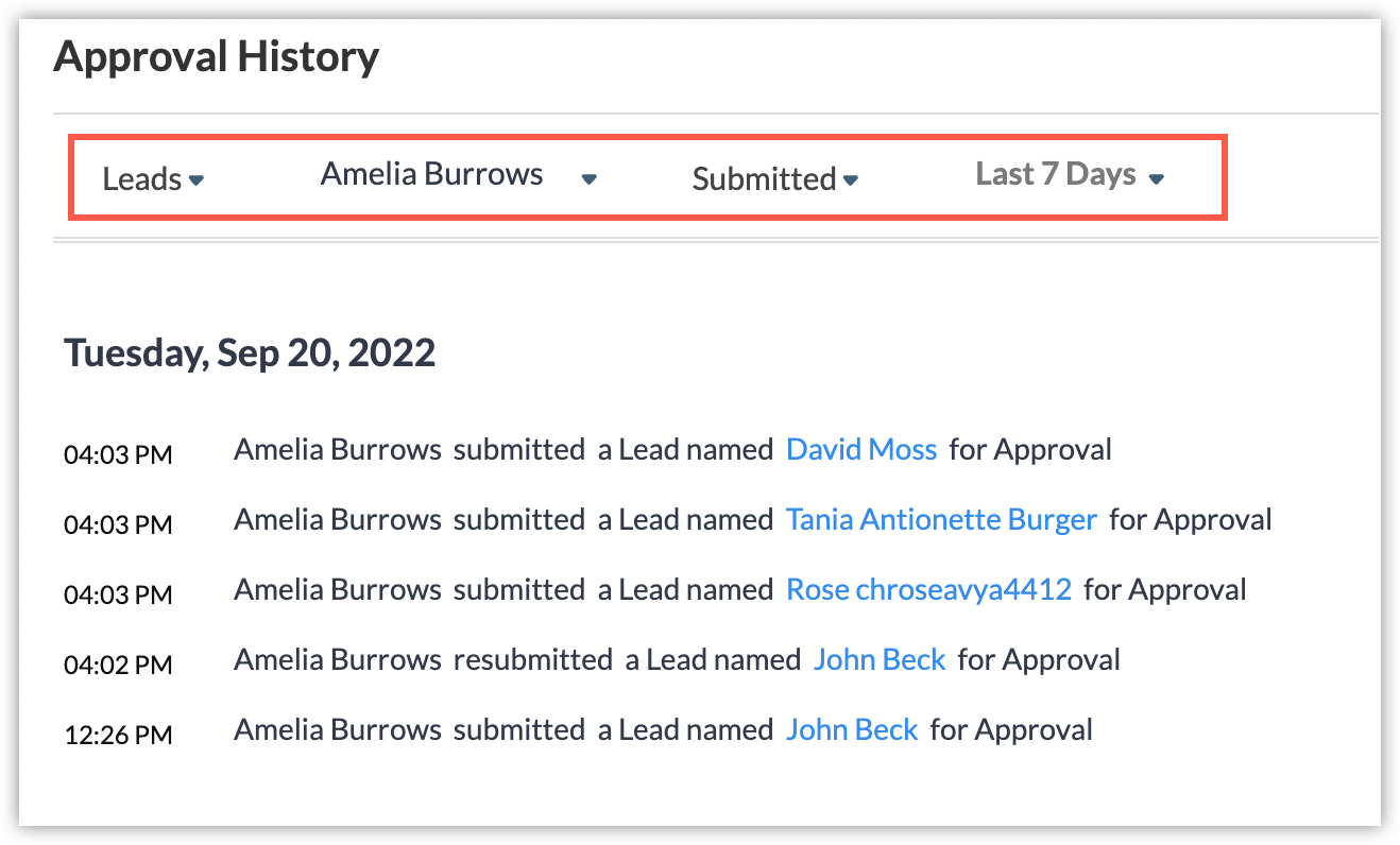例如,如果您想要查看最近 7 天内线索模块中特定用户提交审批的所有记录
