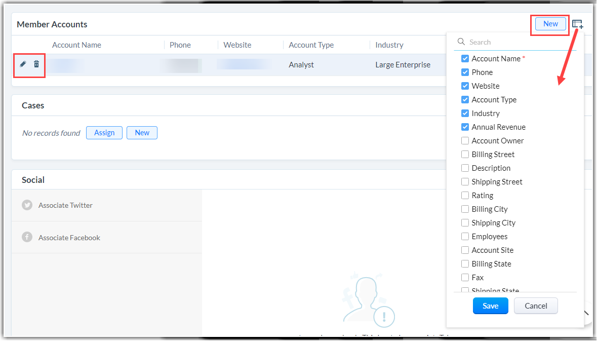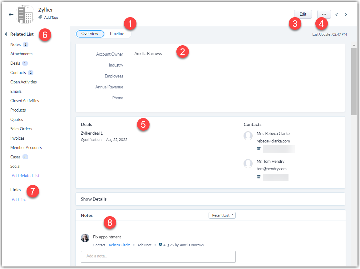 一旦您创建了客户,您可以在记录的详细信息页面查看客户详细信息。 客户的详细信息页面会在某个单独的位置显示客户相关信息——例如客户相关的商机和联系人,任务、通话及会议,备注,电子邮件等等。