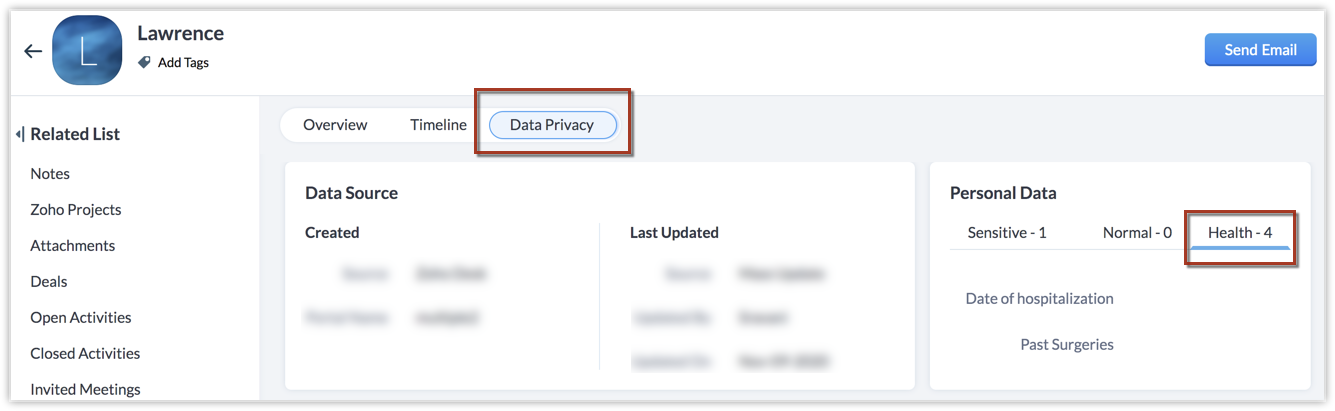 所有标记为包含个人健康数据的字段都将在记录详情页中列出。在 数据隐私 下的个人数据部分,您可以点击健康标签,查看含有个人健康数据的字段。